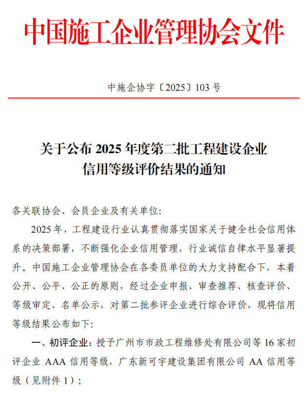 近日,中国施工企业管理协会正式公布 2025 年度第二批工程建设企业信用等级评价结果,兰州市政建设集团有限责任公司凭借稳健的经营实力、规范的管理体系、卓越的履约能力及良好的社会信誉,首次获评中国施工企业管理协会 AAA 级信用企业。